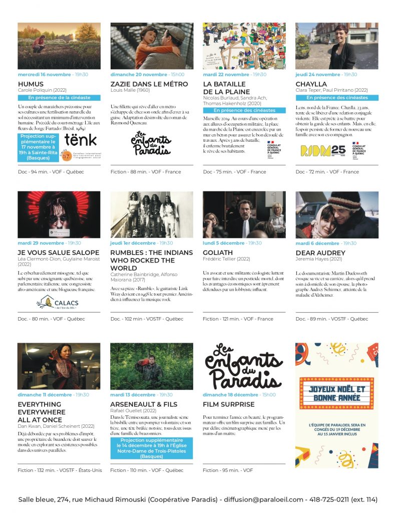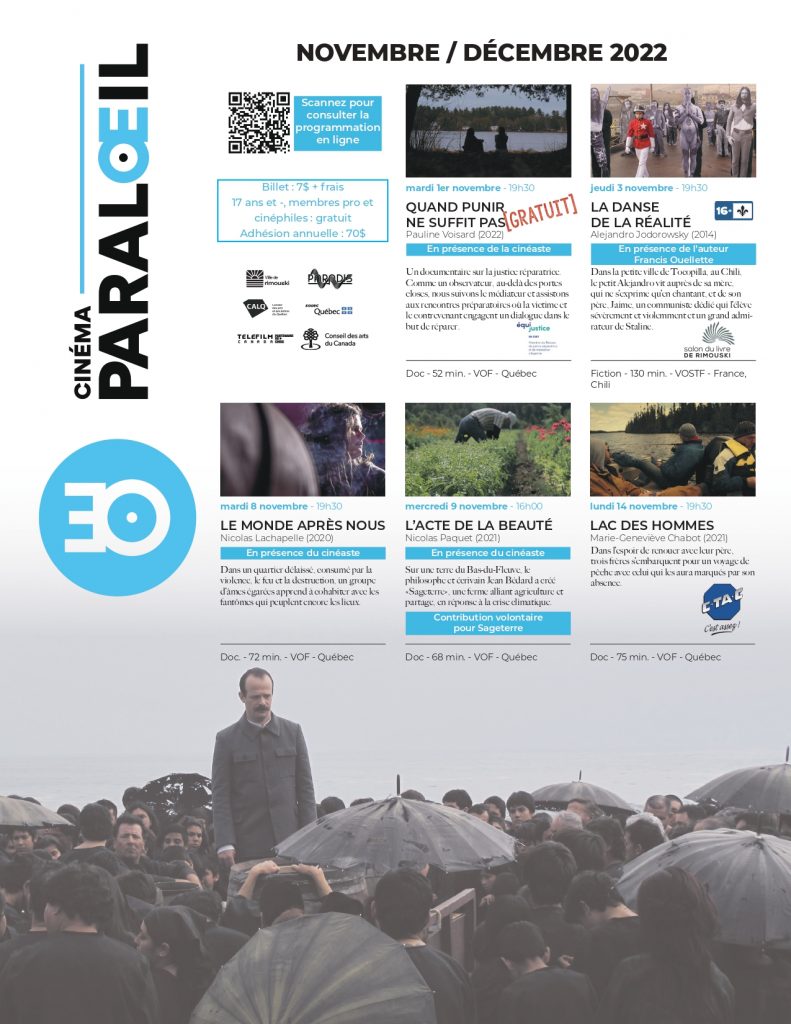 Ça commence fort avec ce qui devient une tradition, celle d’offrir une carte blanche de programmation à un auteur invité au Salon du livre de Rimouski. Cette année, nous accueillons Francis Ouellette, celui dont le premier roman, Mélasse de Fantaisie, ne tarit pas d’éloges, et qui porte aussi le chapeau de distributeur chez FunFilm. Francis nous parlera de l’influence de l’immense Alejandro Jodorowsky dans sa vie et son écriture. Il a choisi de revoir avec nous La danse de la réalité (3 novembre)… ça promet d’être une discussion enlevante. Nous sommes très heureux d’une première collaboration avec l’organisme C-TA-C, avec qui nous présentons le magnifique et très sensible Lac des hommes (14 novembre), soulignant ainsi la Semaine québécoise pour la santé et le bien-être des hommes. Le 24 novembre, nous accueillons un duo de France, Clara Teper et Paul Pirritano, pour nous présenter Chaylla, un documentaire présenté dans le cadre des Rencontres internationales du documentaires. Le film suit le parcours d’une femme qui tente de se libérer d’une relation conjugale violente, tout en espérant faire sa vie avec ce même homme, père de ses enfants. Un film juste et criant de vérité. Nous terminerons le mois en compagnie de l’organisme CALACS pour la présentation du très attendu Je vous salue salope (29 novembre).