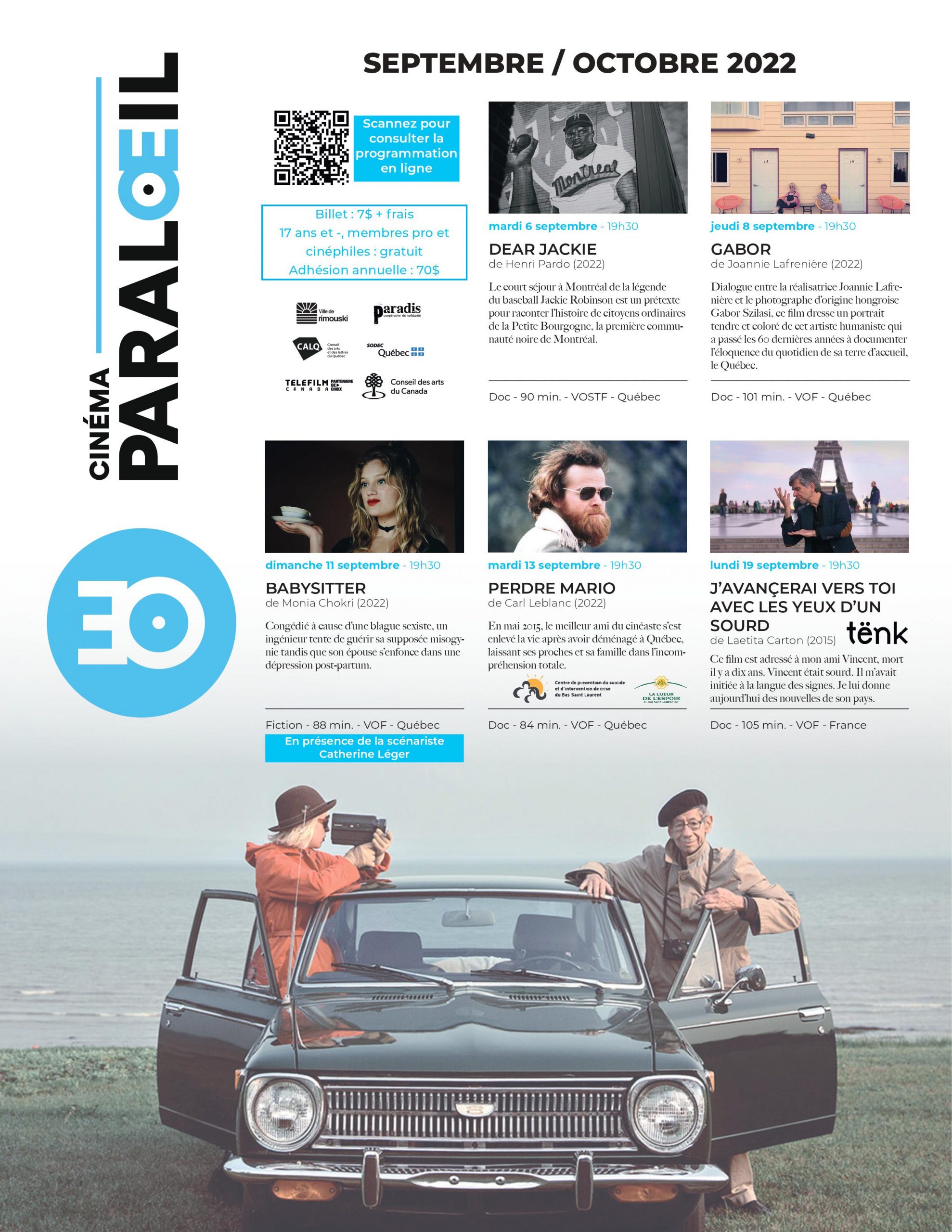 Nous vous proposons de débuter la saison dans le quartier Petite-Bourgogne à Montréal, surnommé «le Harlem du Nord» ; celui-là même qui a vu naître le pianiste Oscar Peterson. Dans Dear Jackie (6 septembre), le court séjour à Montréal de la légende du baseball Jackie Robinson est un prétexte pour raconter l’histoire de citoyens ordinaires de la première communauté noire de Montréal. Puis, laissez vous porter par la douce folie de Joannie Lafrenière dans ce portrait en forme de dialogue avec l’attachant photographe Gabor Szilasi (Gabor, 8 septembre). Nous aurons la visite de Catherine Léger, scénariste de l’audacieux Babysitter (11 septembre). Occasion à saisir pour discuter de l’écriture de cette pièce de théâtre devenue film sous la direction de Monia Chokri. Nous soulignerons la Journée mondiale de la prévention du suicide avec la présentation de Perdre Mario (13 septembre). Suivra une discussion en compagnie des gens de la Lueur de l’Espoir et du Centre de prévention du suicide. Notre collaboration avec la plateforme Tenk se poursuit avec la présentation de J’avancerai vers toi avec les yeux d’un sourd (19 septembre). Le film sera aussi disponible en ligne et fait partie d’une escale thématique sur le langage des signes.