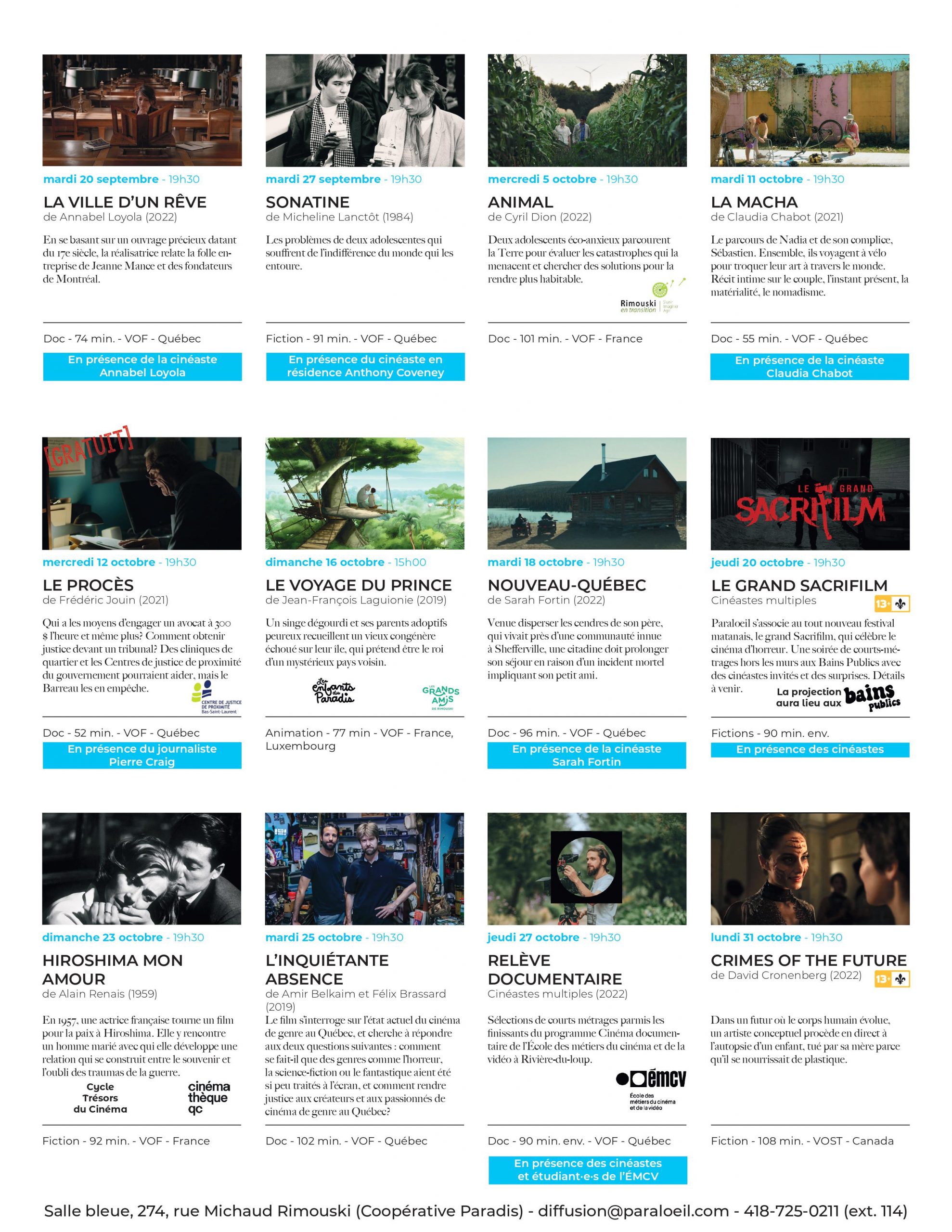 En octobre, nous accueillerons la cinéaste Sarah Fortin pour Nouveau Québec (18 octobre), et nous irons festoyer aux tout nouveaux Bains Publics pour une présentation hors les murs de courts métrages d’horreur. Cet évènement est une co-présentation dans le cadre de la 2e édition du festival matanais Le grand Sacrifilm (20 octobre). Finalement, nous inaugurons un cycle Trésors du cinéma en collaboration avec la Cinémathèque québécoise pour la diffusion d’une version restaurée du chef d’œuvre d’Alain Resnais, Hiroshima mon amour (23 octobre).