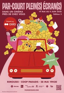 Pour la 3e édition du Par-Court, Plein(s) Écran(s) prend la route avec sa valise bien remplie de courts métrages d’ici et fait escale dans 10 cinémas aux quatre coins du Québec. Une soirée pour découvrir, échanger et tomber en amour avec le court métrage québécois.