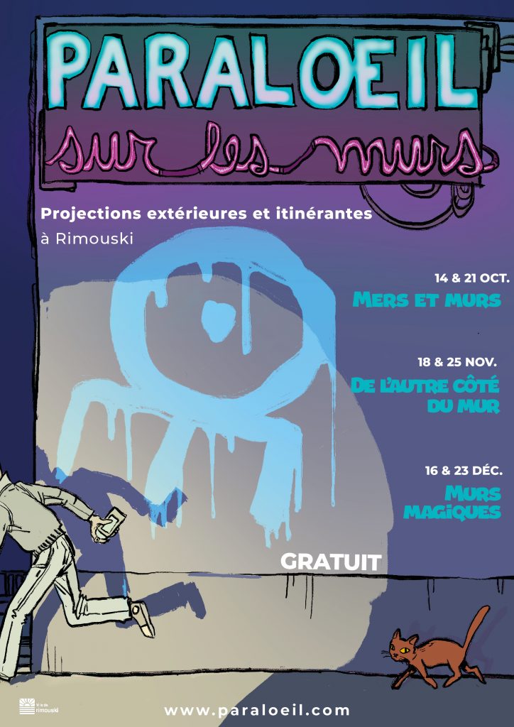 Paralœil sur les murs ce sont des parcours au centre-ville de Rimouski, qui convient le public à un point de départ, et l’invitent à suivre un guide au fil d’un itinéraire à pied, pour une expérience insolite de cinéma urbain.